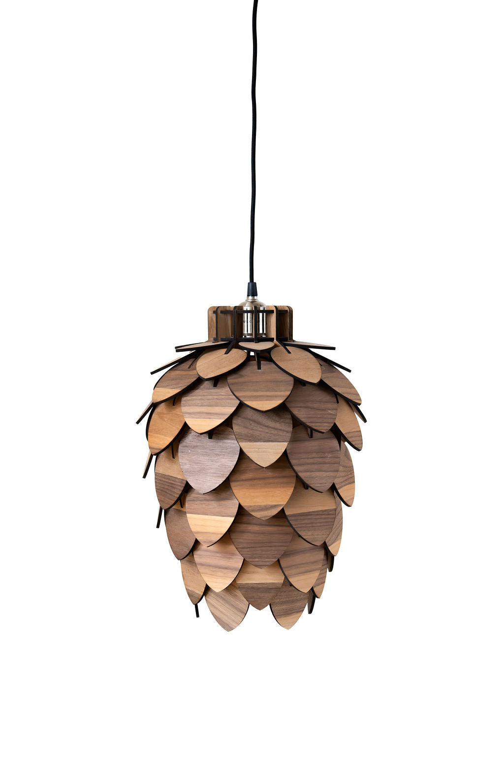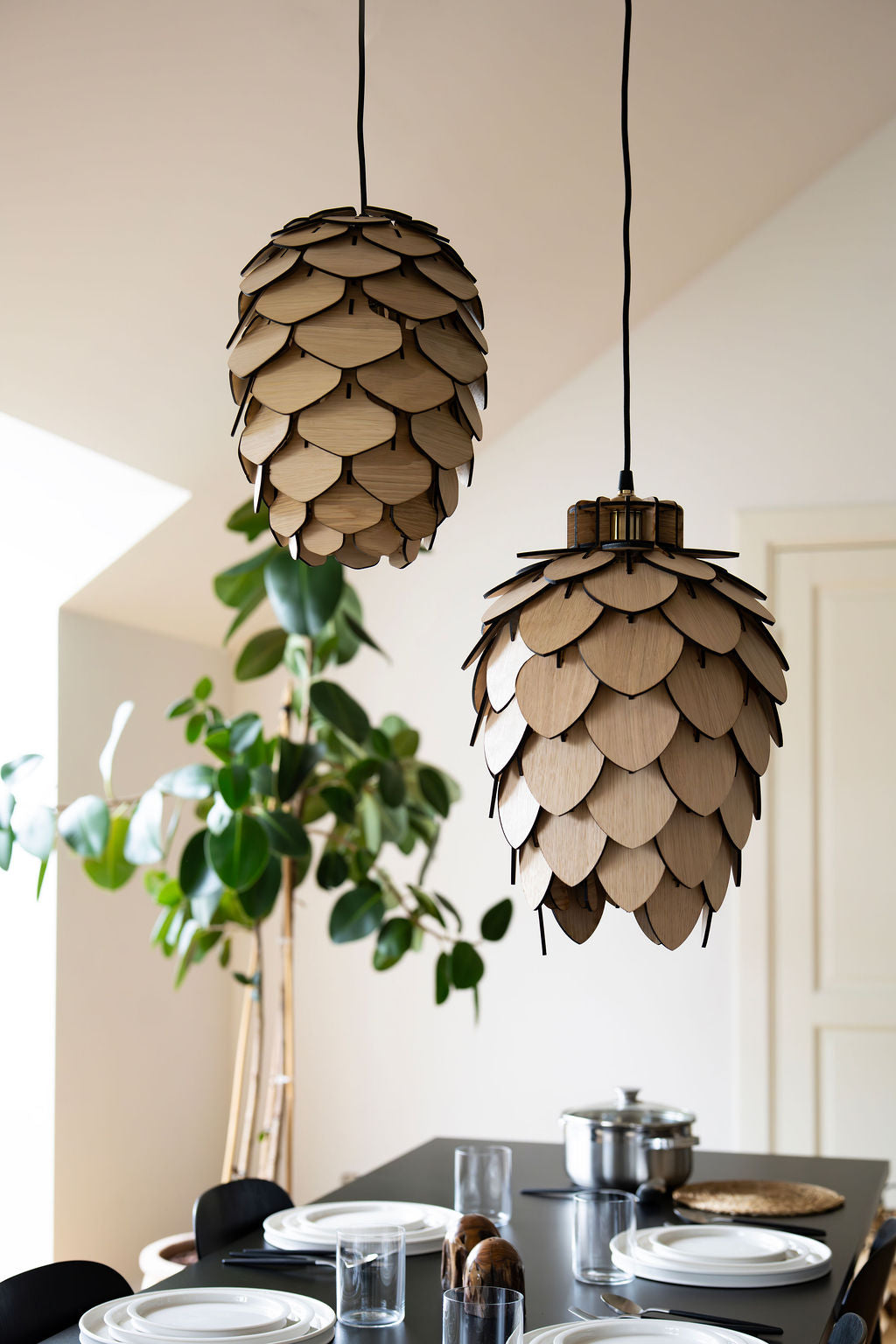 Trollskog tillverkas för hand i valnöt, ek eller furu, vilket gör varje lampa unik i sin karaktär. Den passar utmärkt som solitär men gör sig särskilt vacker i grupp – exempelvis hängd flera i rad över ett längre bord.