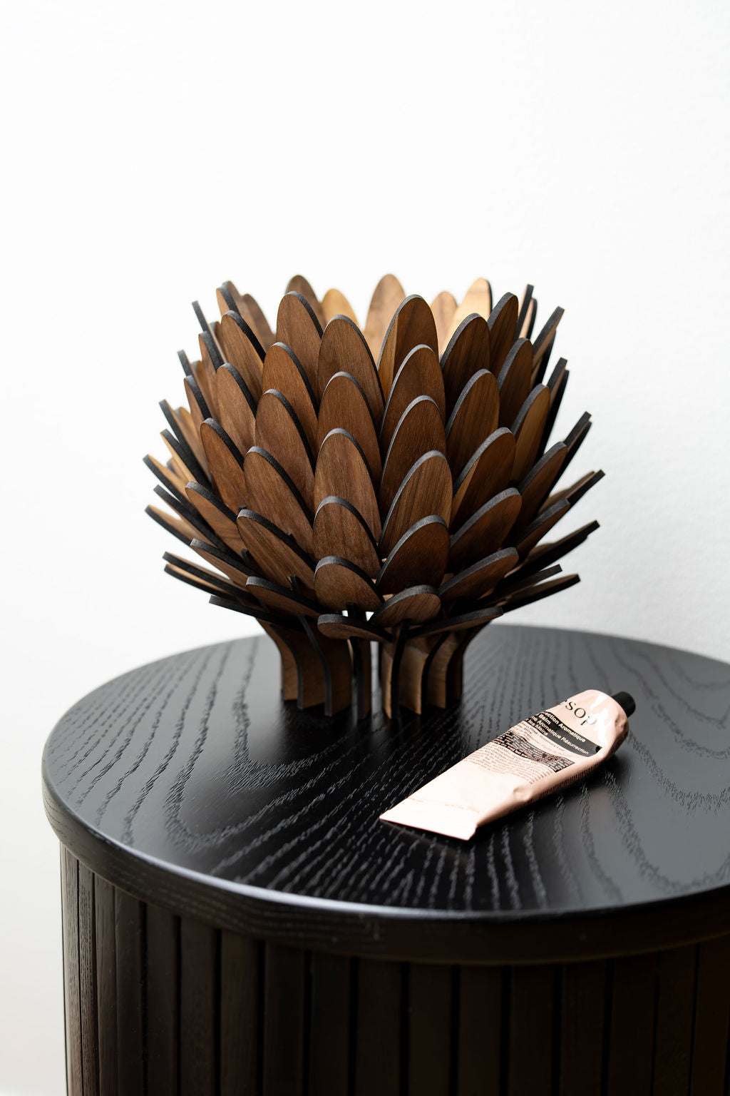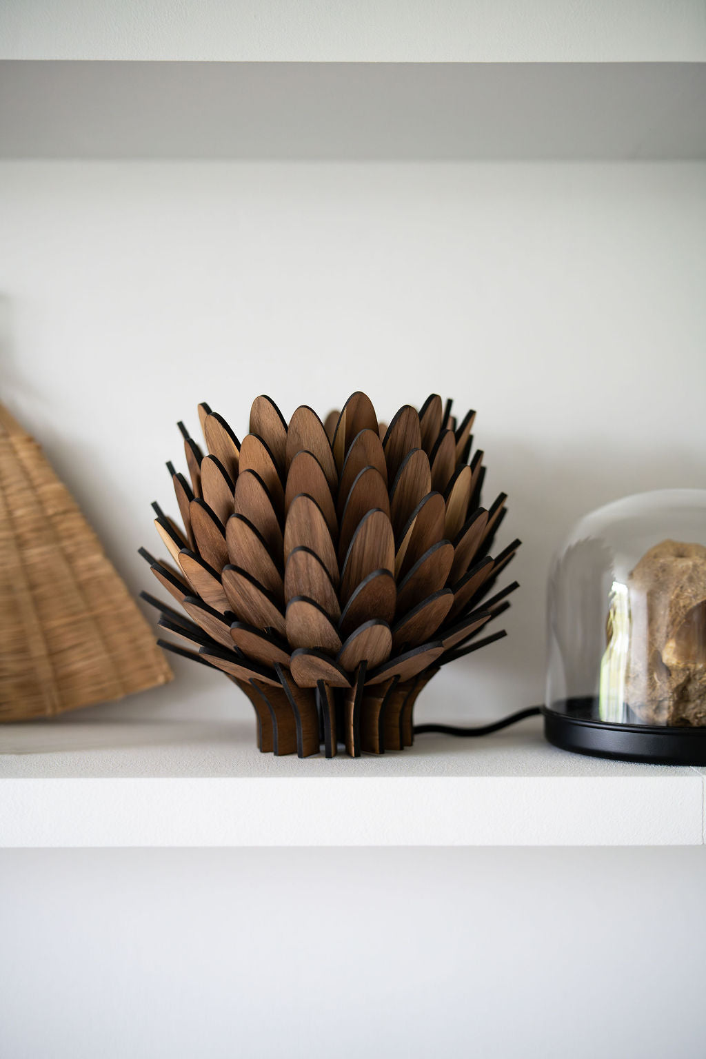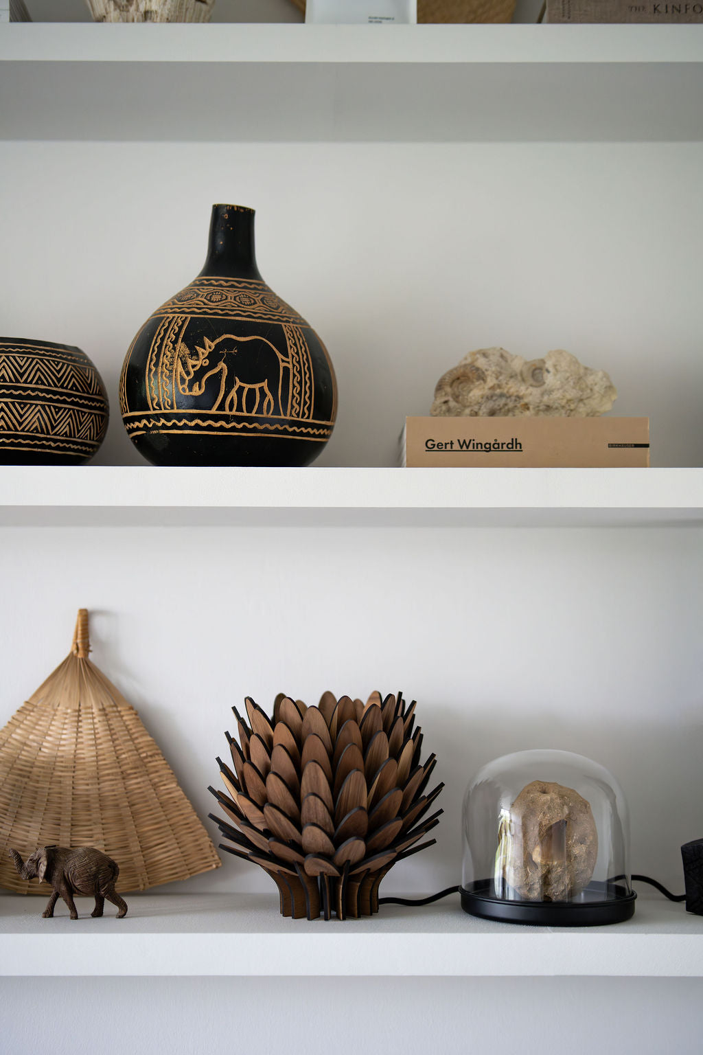 Den är perfekt för mindre ytor där du vill addera ett mjukt, stämningshöjande sken. Trots sin storlek sprider den ljuset genom träets organiska bladstruktur på ett sätt som förhöjer atmosfären i rummet – subtilt, vackert och harmoniskt.