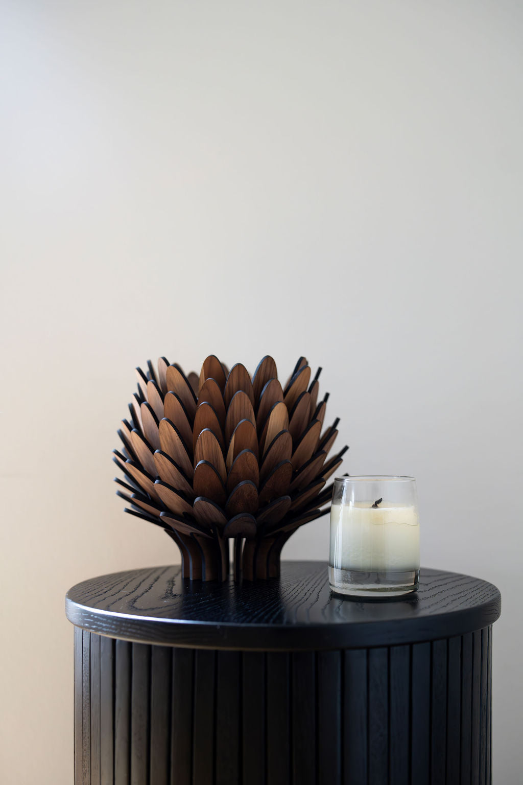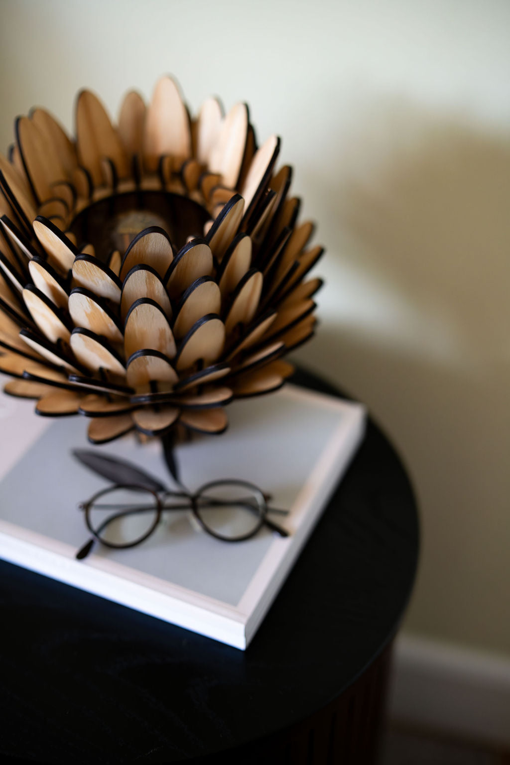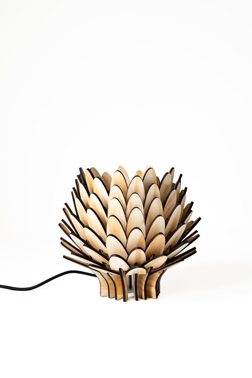 Den är perfekt för mindre ytor där du vill addera ett mjukt, stämningshöjande sken. Trots sin storlek sprider den ljuset genom träets organiska bladstruktur på ett sätt som förhöjer atmosfären i rummet – subtilt, vackert och harmoniskt.